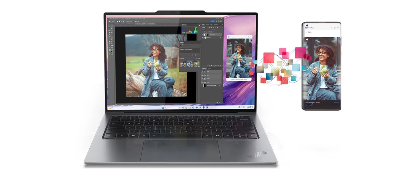 Funkce Smart Share okamžitě propojí váš chytrý telefon s notebookem prostřednictvím virtuálního snímače s umělou inteligencí. Stačí přiložit zařízení se systémem Android™ nebo iOS k notebooku - a pak přetáhnout. Upravujte fotografie a snadno je sdílejte. Navíc získejte přístup k textovým zprávám a posílejte je z počítače.